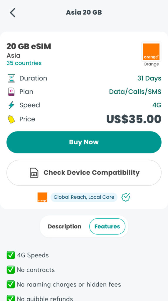 For this specific trip, I went with their 20GB plan for 30 days, which was only 36 USD. I thought that was a great deal, but I’ve also used their “Asia” plan before. That one also gives you 20GB but covers almost every country in Southeast Asia. That was a lifesaver when I was backpacking and hopping between countries every couple of weeks!